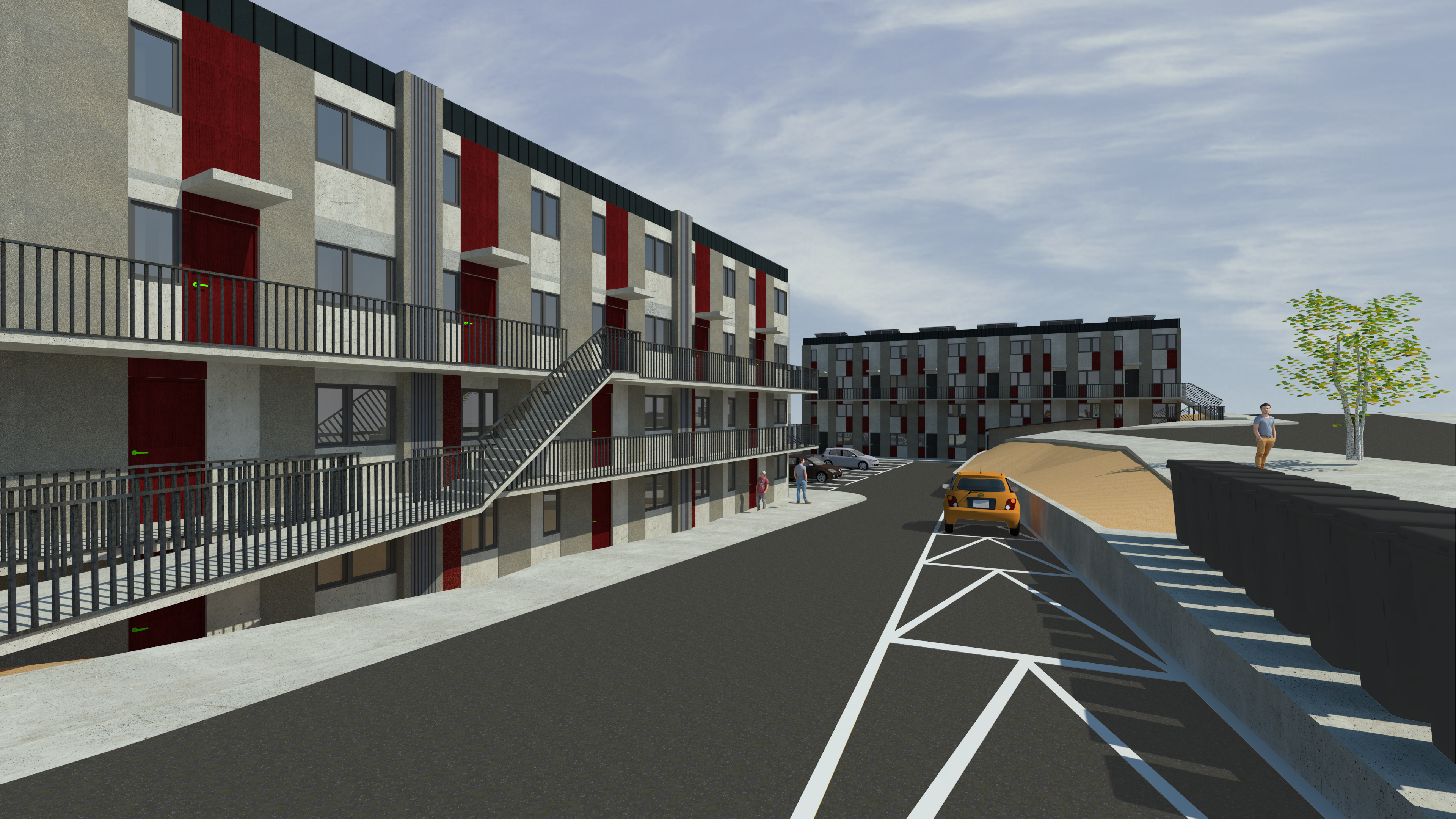 El proyecto “Nuevo Amanecer”, patrocinado por la EGIS Municipal, contempla edificios de estructura de hormigón con departamentos dúplex con dos baños, cuatro dormitorios, cocina, estar comedor y logia.