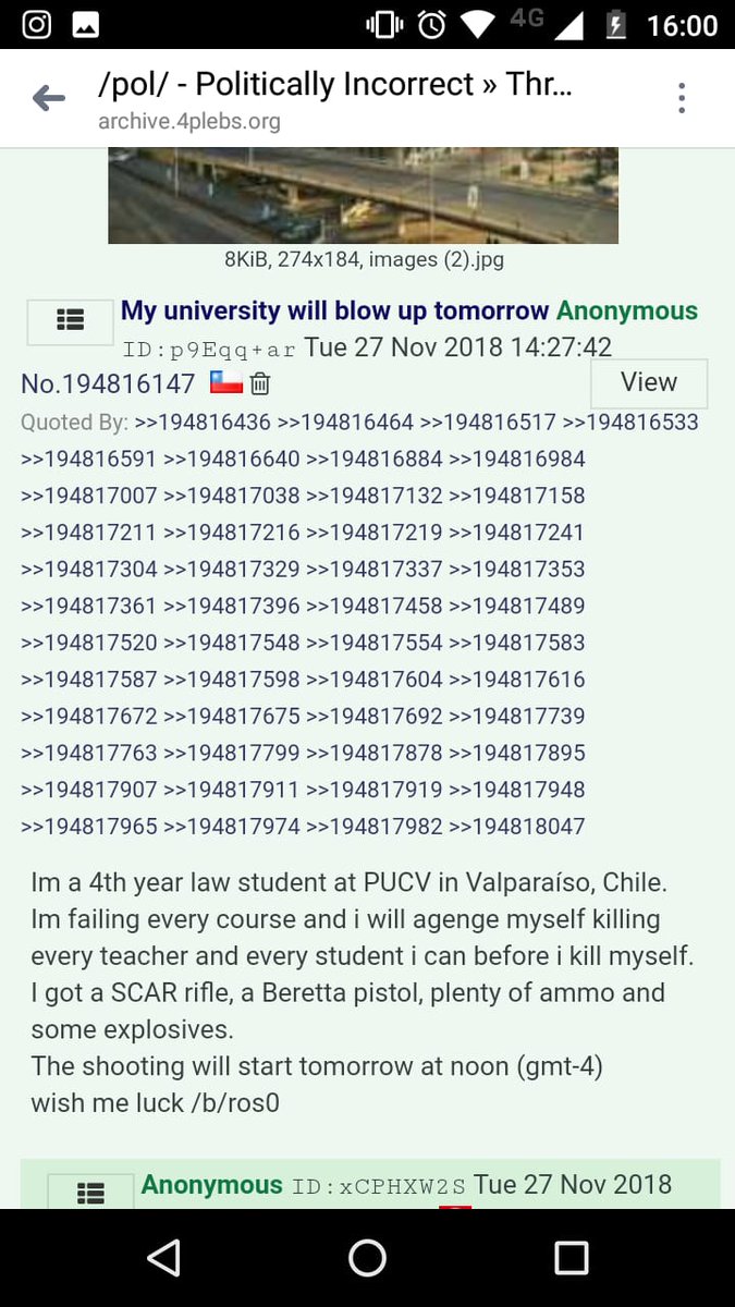Un anónimo, que dice ser alumno de la casa de estudios, escribió en inglés en el foro web 4chan: «Estoy en cuarto año de derecho en la Universidad Católica de Valparaíso, he reprobado todos mis ramos y intentaré a matar a cada profesor y estudiante que pueda antes de suicidarme”. En el posteo también indica tener un rifle, una pistola, munición y explosivos para ejecutar el tiroteo que comenzaría mañana miércoles al mediodía.
