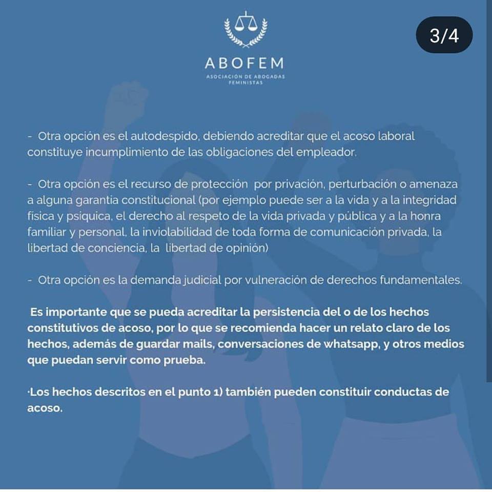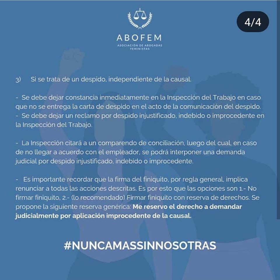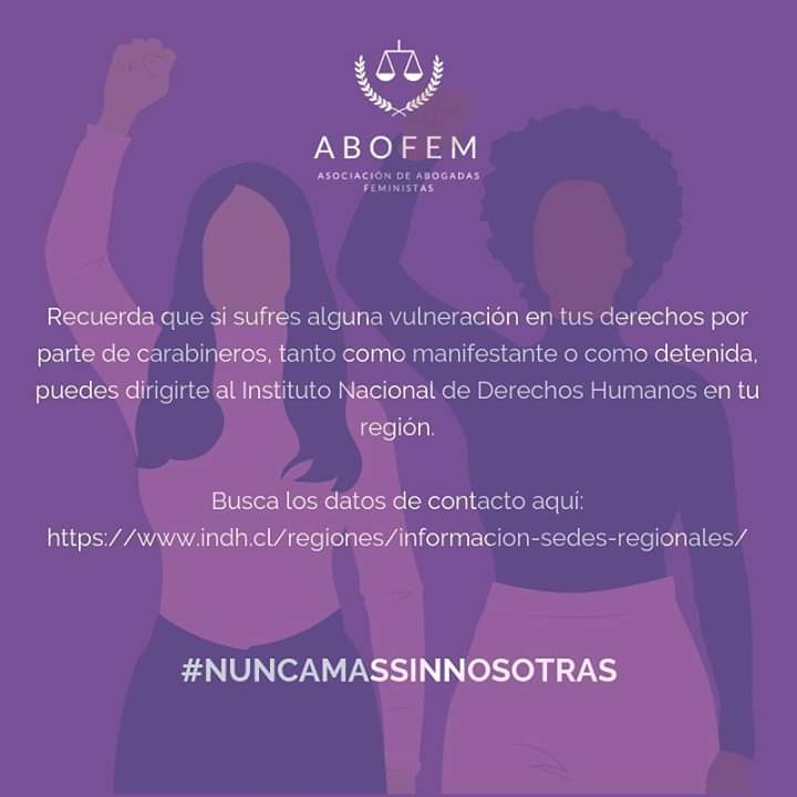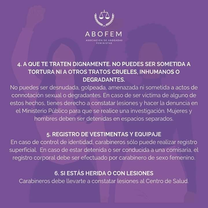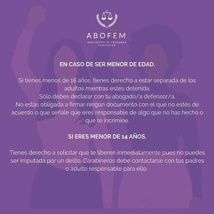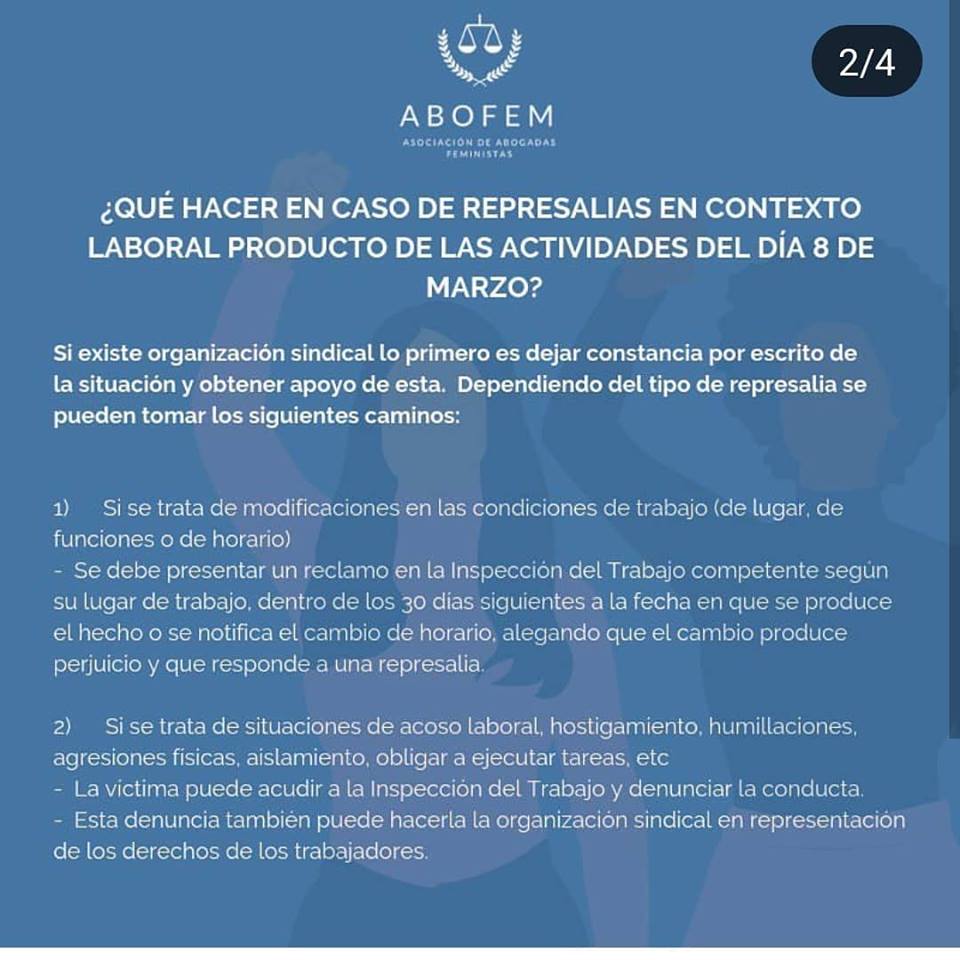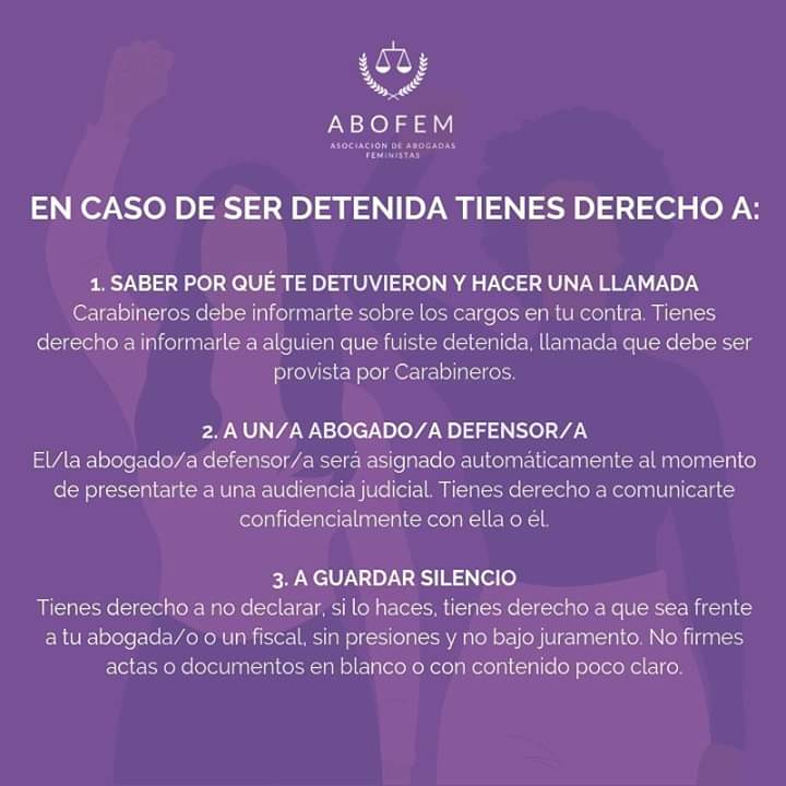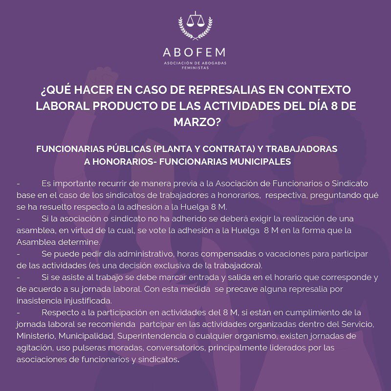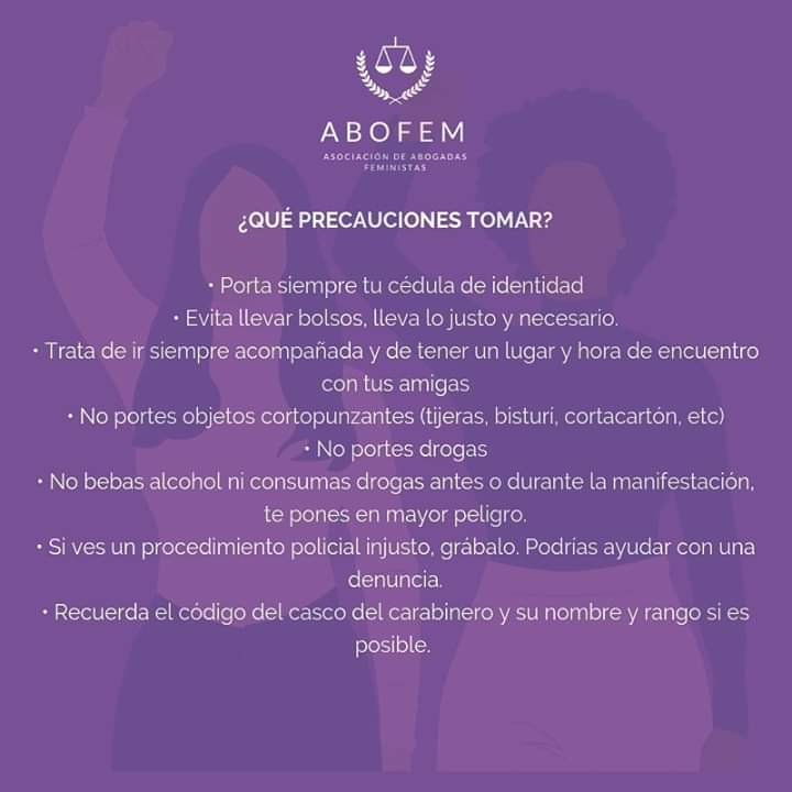 Para todas estas mujeres que adhieren a la Huelga General Feminista, la Asociación de Abogadas Feministas de Chile (ABOFEM) elaboró una serie de cartillas, una para el autocuidado en caso de ser detenida durante una manifestación, y dos dirigidas a mujeres que trabajan en el sector público y privado donde se especifican sus derechos en caso de represalias producto de su participación en alguna acción de protesta.