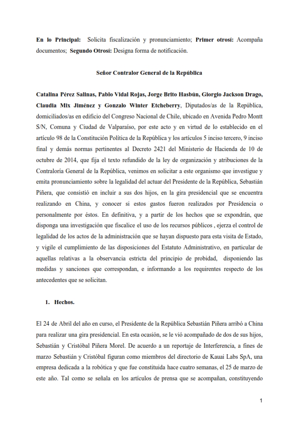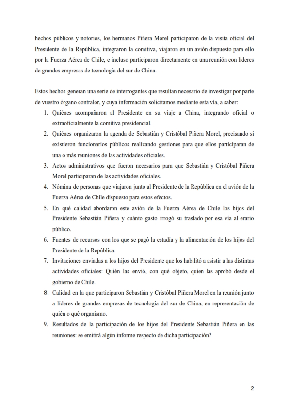 En el escrito, los parlamentarios solicitan a la Contraloría se pronuncie respecto de la legalidad del actuar del Presidente de la República, que consistió en incluir a dos de sus hijos en la gira presidencial que se encuentra realizando en el país asiático, y conocer si estos gastos fueron realizados por la Presidencia de la República o fueron costeados personalmente por éstos, como declaró la vocera de Gobierno, Cecilia Pérez.