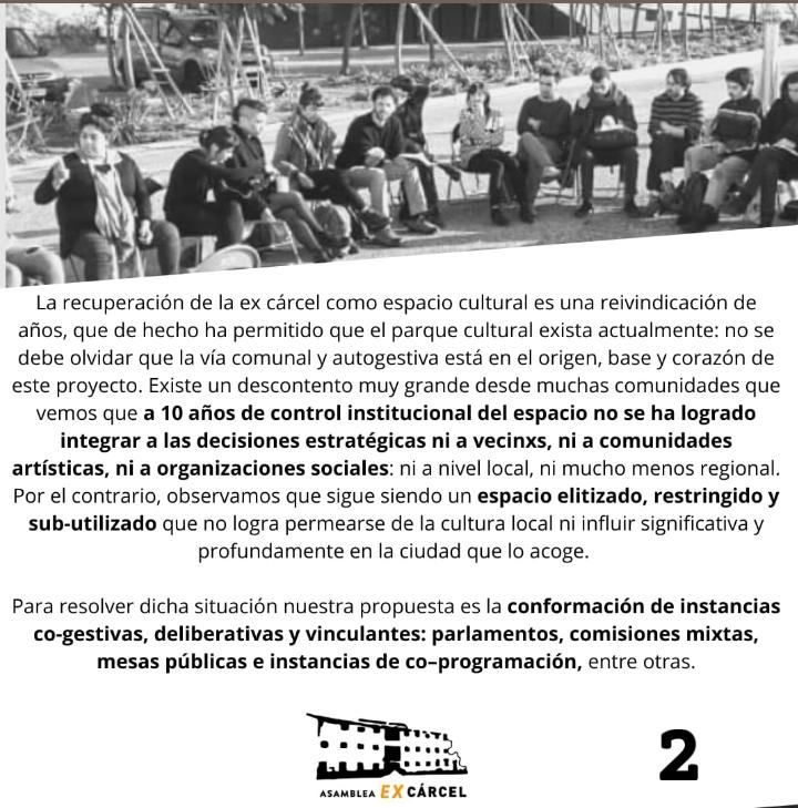 En declaración pública, la agrupación sostiene que «a 10 años de control institucional del espacio, no se ha logrado integrar a las decisiones estratégicas ni a vecinxs, ni a comunidades artísticas, ni a organizaciones sociales; ni a nivel local ni mucho menos regional».