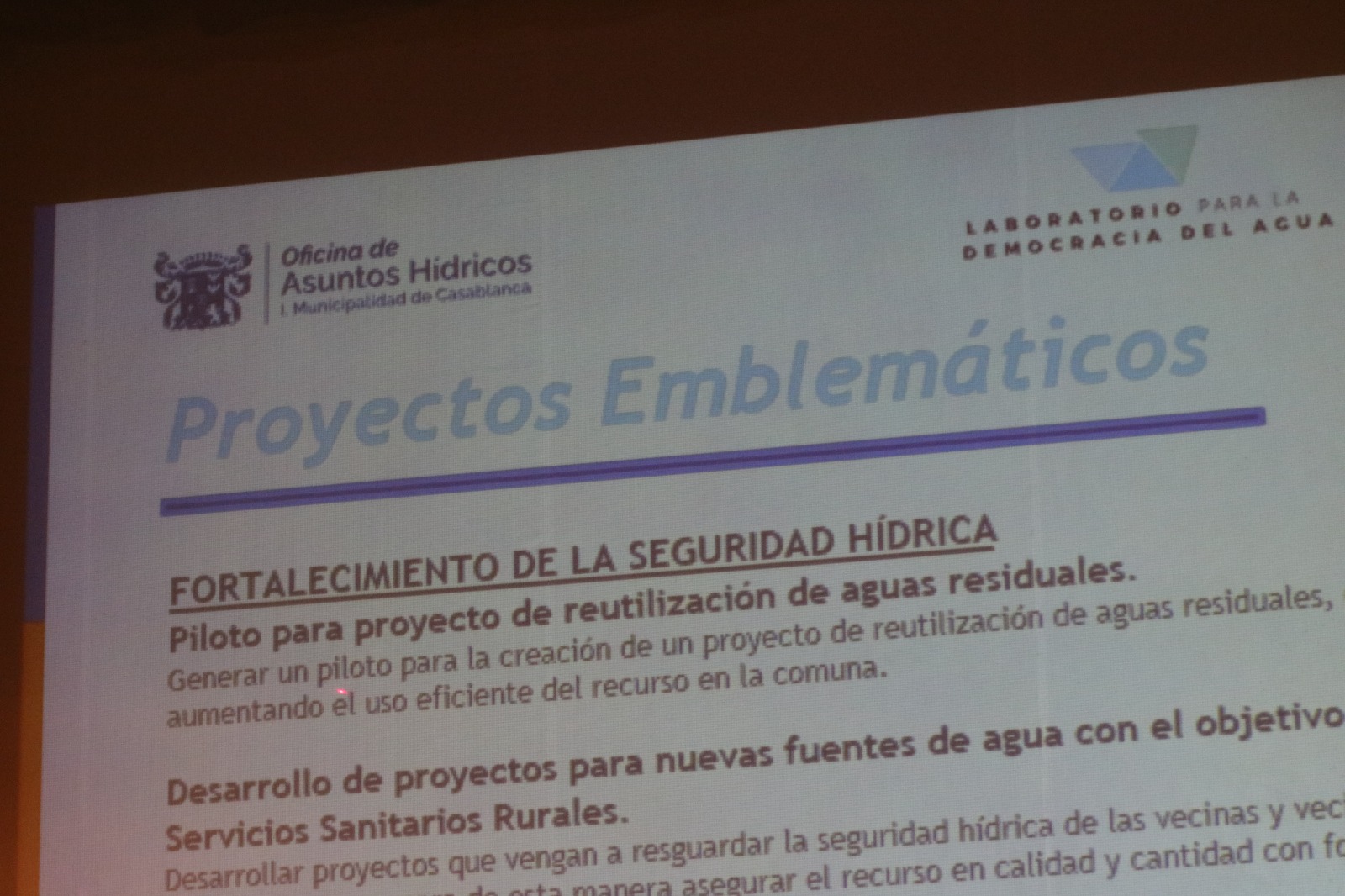 // Este miércoles 8, en dependencias del Teatro Municipal de Casablanca, se presentó la Estrategia Hídrica Local con la presencia del alcalde de la comuna, Francisco Riquelme López, la secretaria regional ministerial de Agricultura de la Región de Valparaíso, Yolanda Cisternas, el seremi del Ministerio de Obras Públicas, Yanino Riquelme, junto a coordinadores de oficinas hídricas de varias comunas del país, quienes expusieron sus experiencias territoriales. La actividad fue organizada por la Oficina de Asuntos Hídricos Municipal y cuenta con el apoyo de la Asociación de Municipalidades de la Región de Valparaíso.