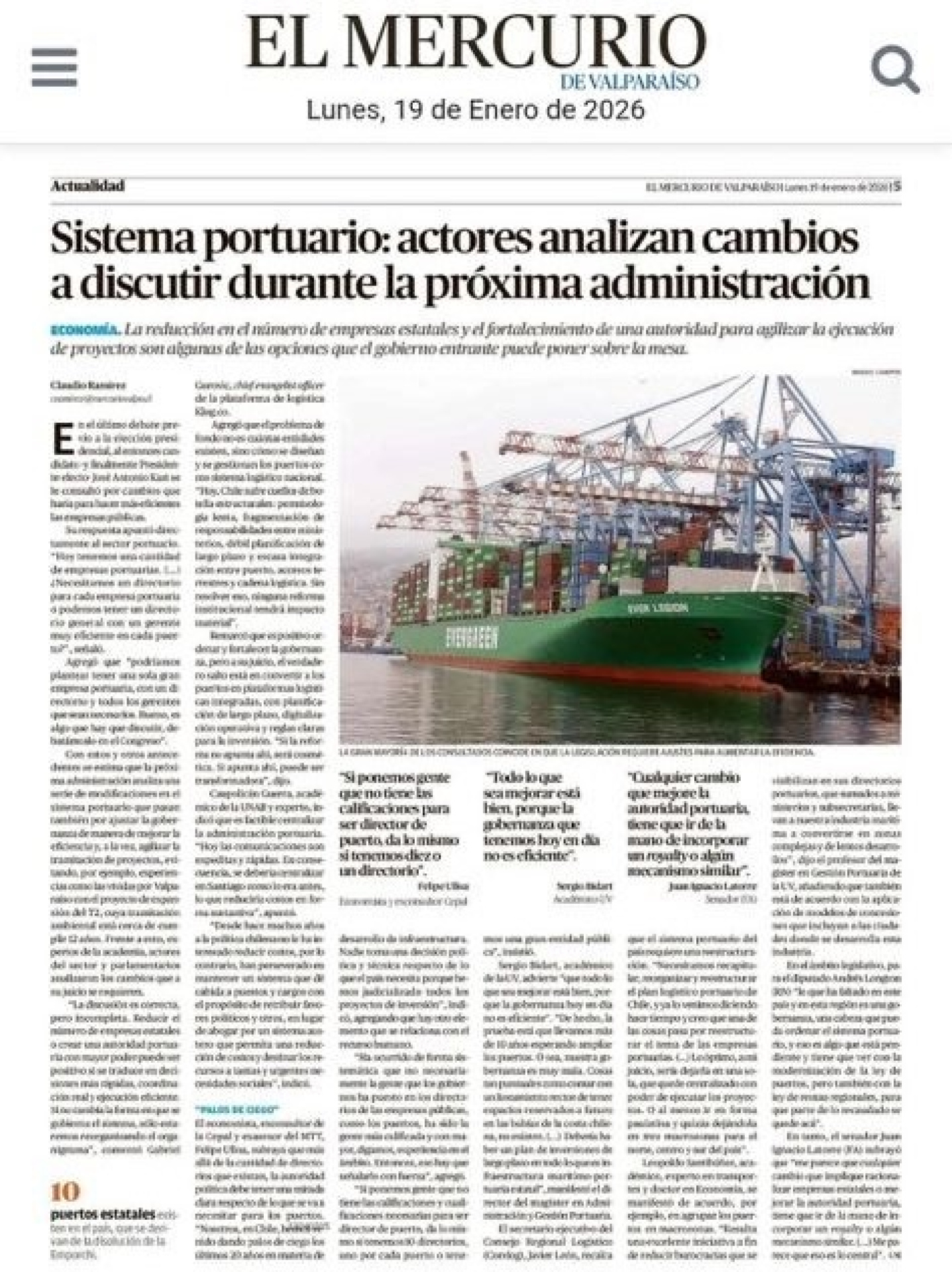 El debate portuario vuelve a instalarse en la agenda pública justo cuando un nuevo gobierno de derecha se instala en el poder ejecutivo. No es casual. En ese contexto, El Mercurio de Valparaíso publica una nota de opinión entrevistando a diversas personalidades para discutir el “futuro del sistema portuario”, pero el “marco” ya está definido de antemano: el problema sería el tamaño del aparato administrativo, el exceso de empresas estatales (10) y la lentitud en la toma de decisiones. La solución, según esa mirada, sería achicar el Estado, concentrar atribuciones y despejar obstáculos para que el negocio funcione con mayor rapidez. Todo lo demás queda fuera del cuadro.